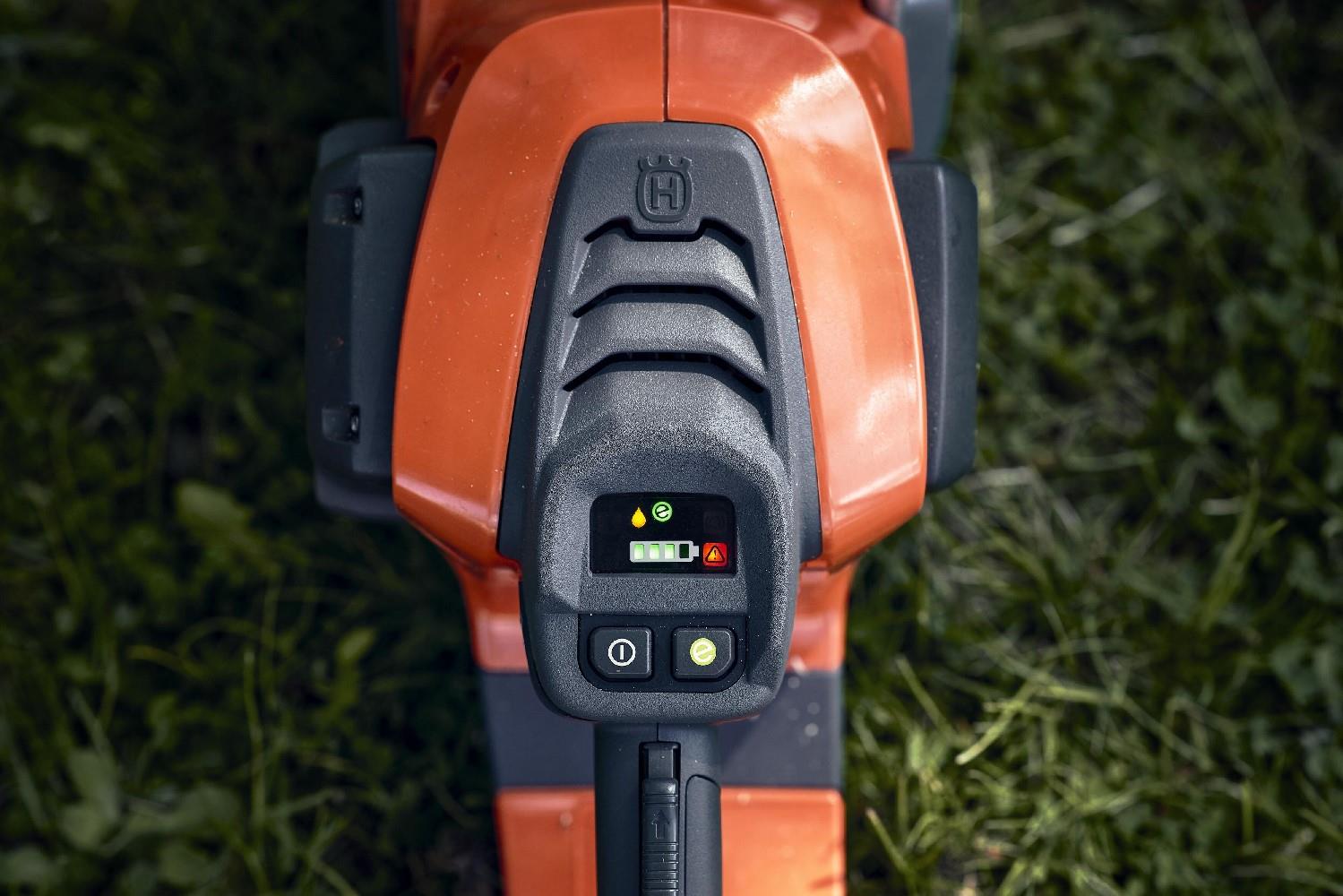 Mit dem leicht zugänglichen Bedienfeld behalten Sie die Kontrolle: Starten und stoppen Sie einfach per Tastendruck. Eine savE-Funktion ermöglicht die Wahl zwischen maximaler Laufzeit oder maximaler Leistung, die Griffheizung lässt sich je nach Bedarf bequem ein- und ausschalten. Der Ladestatus ist bei aktiviertem Akku immer gut sichtbar, das Öltropfensymbol leuchtet auf, wenn das Kettenöl aufgebraucht ist, und es wird angezeigt, wenn die Kettenbremse aktiviert ist.